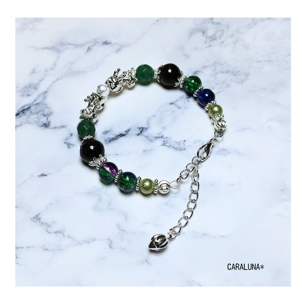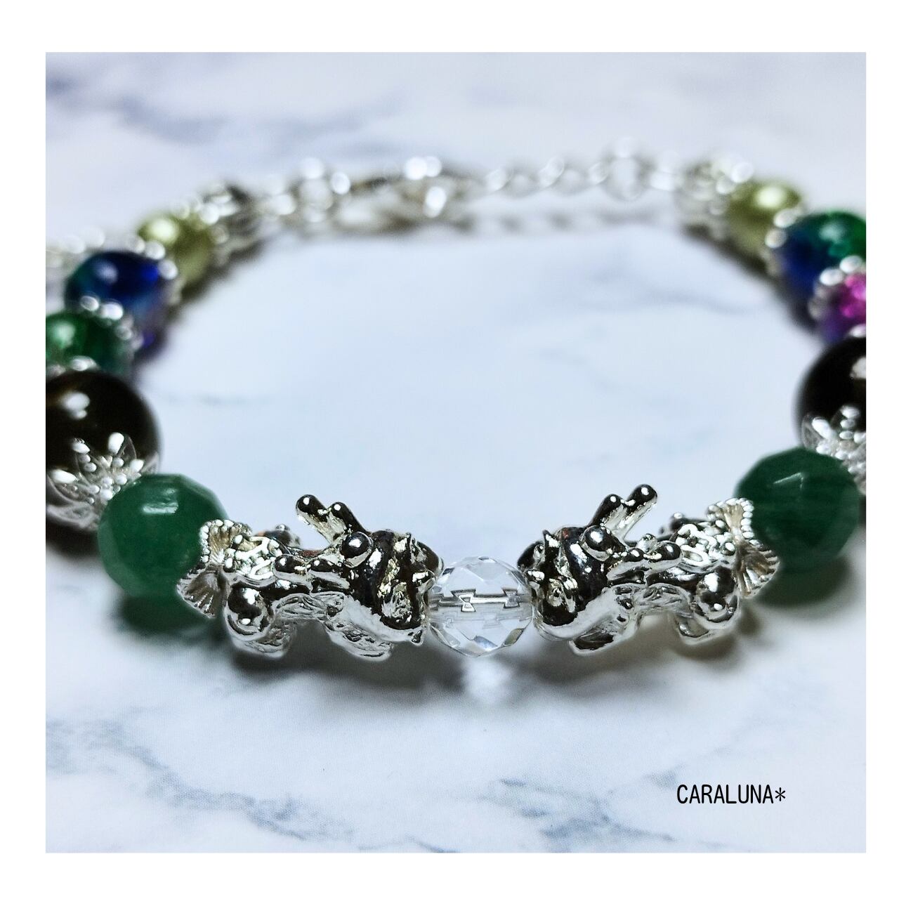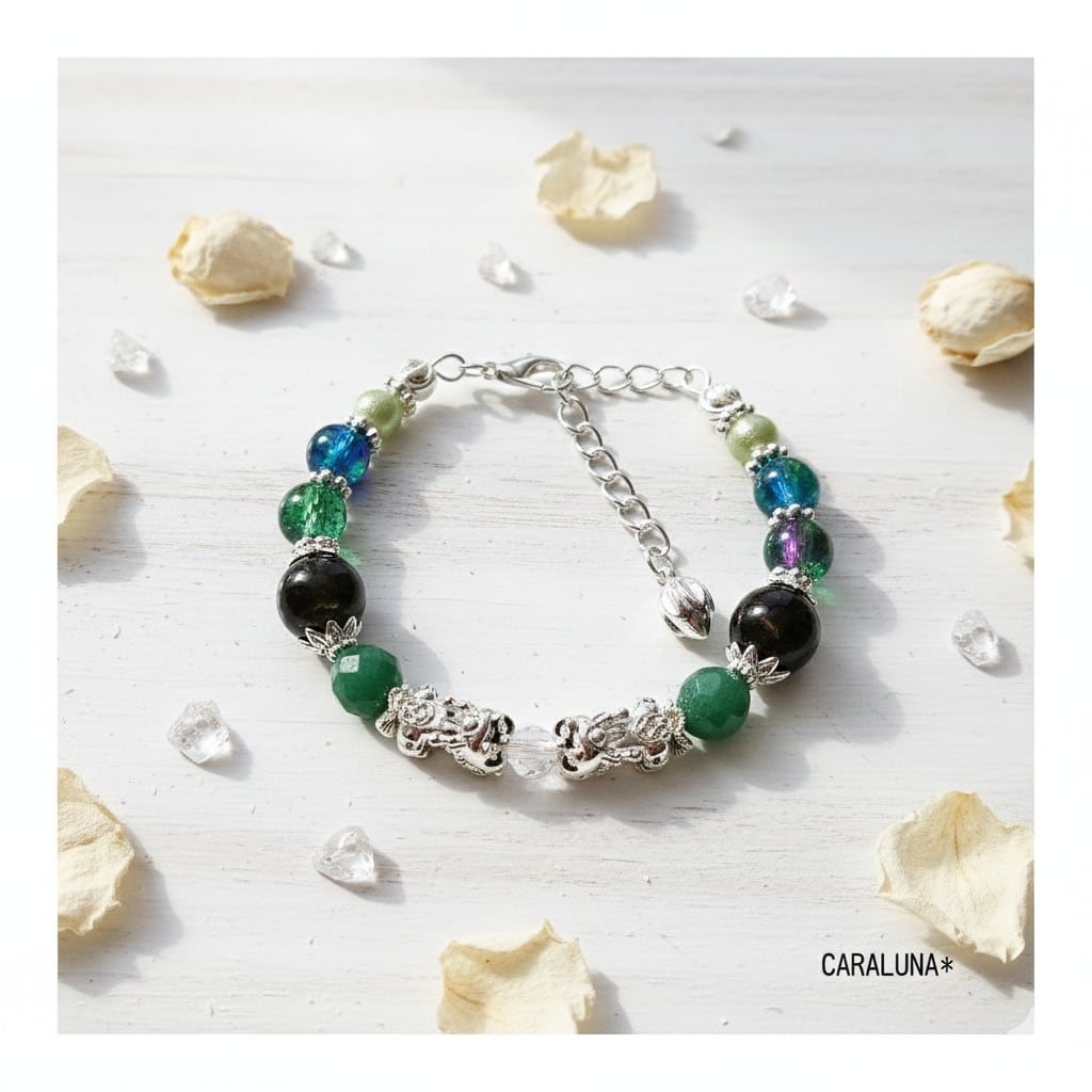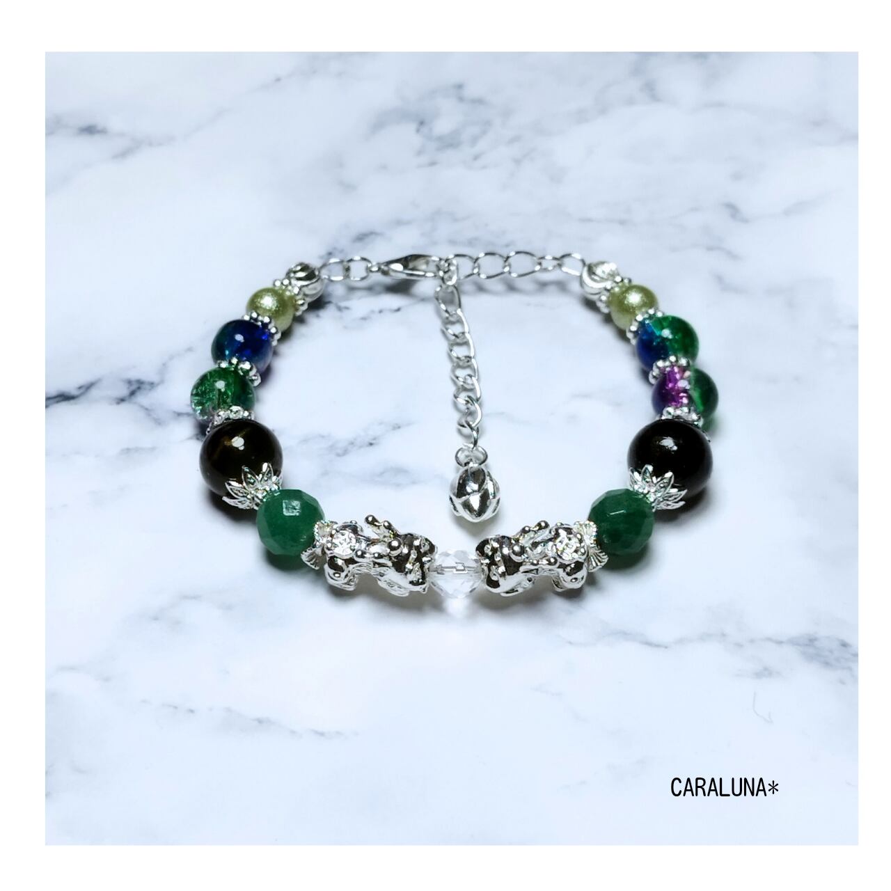 幸運を呼び込むといわれる伝説の守護聖獣「貔貅(ヒキュウ)」をメインに、瑞々しいグリーンカラーの天然石を組み合わせた、お守りブレスレットです。