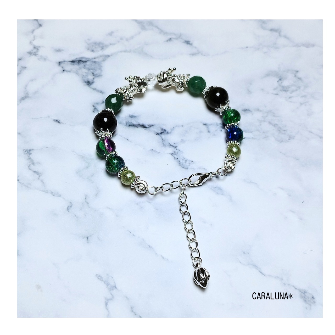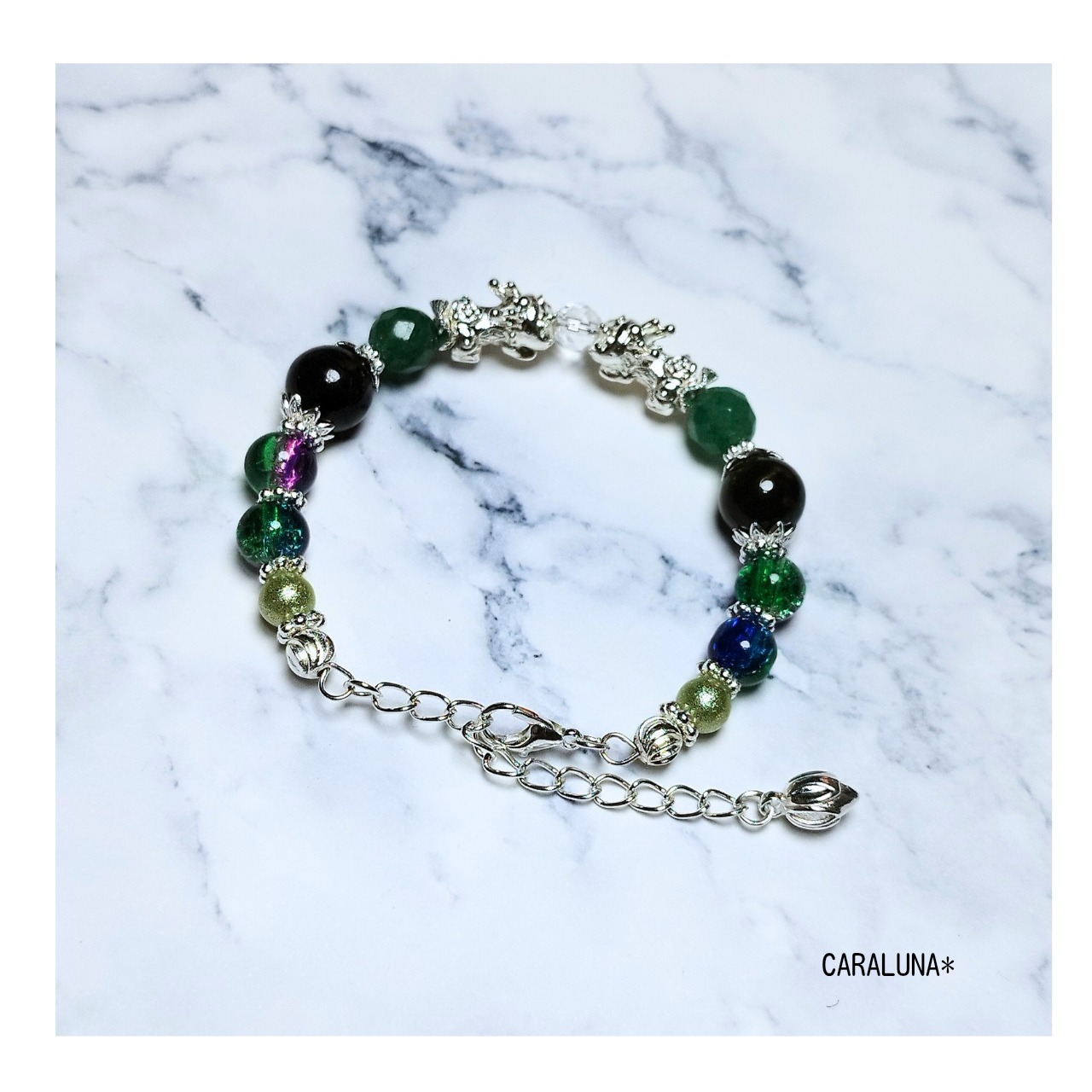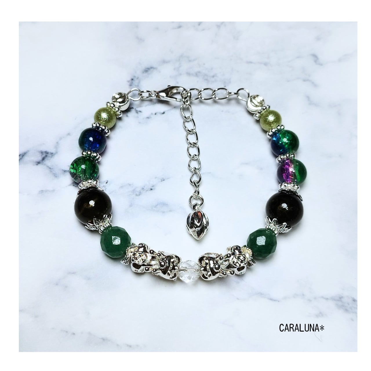 幸運を呼び込むといわれる伝説の守護聖獣「貔貅(ヒキュウ)」をメインに、瑞々しいグリーンカラーの天然石を組み合わせた、お守りブレスレットです。