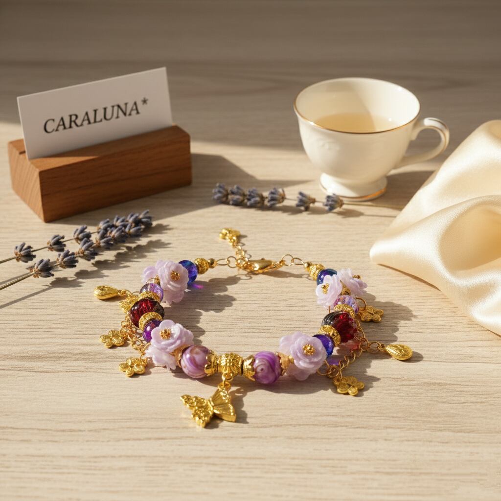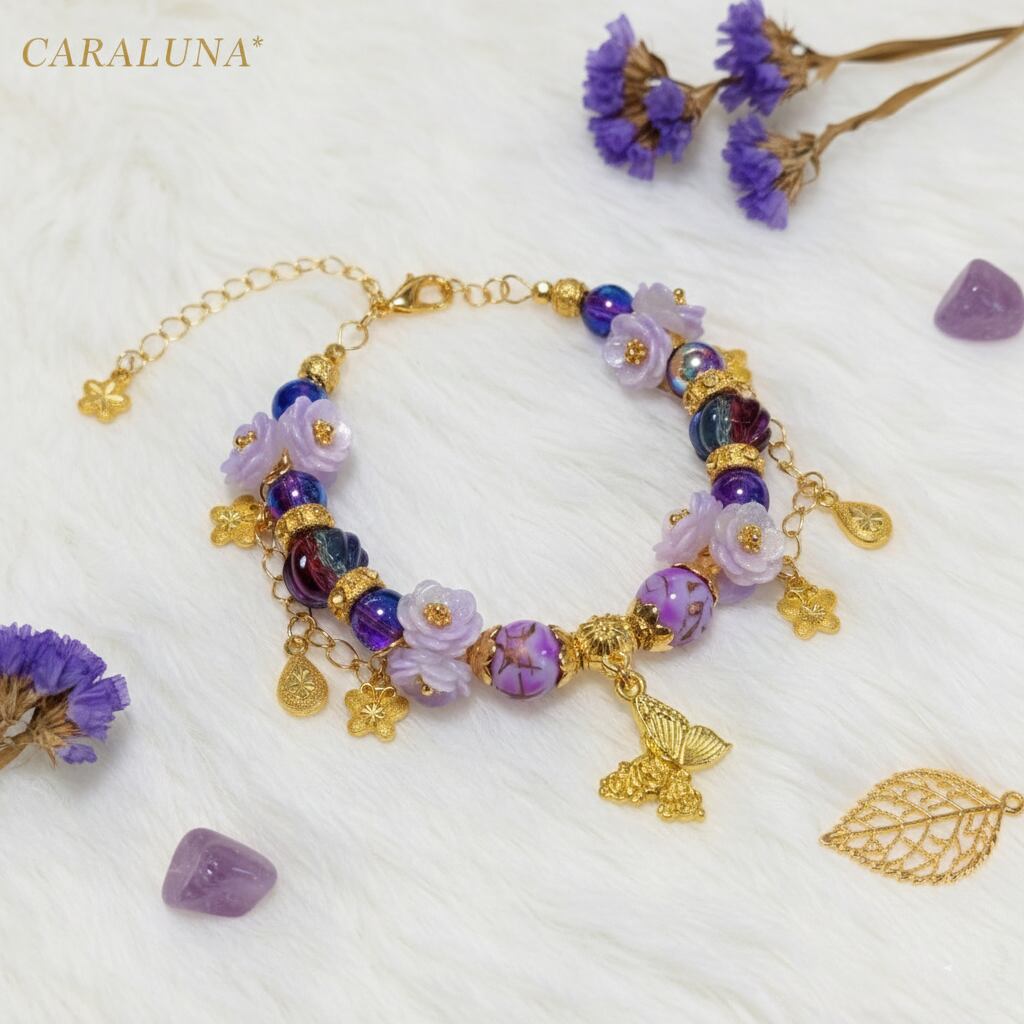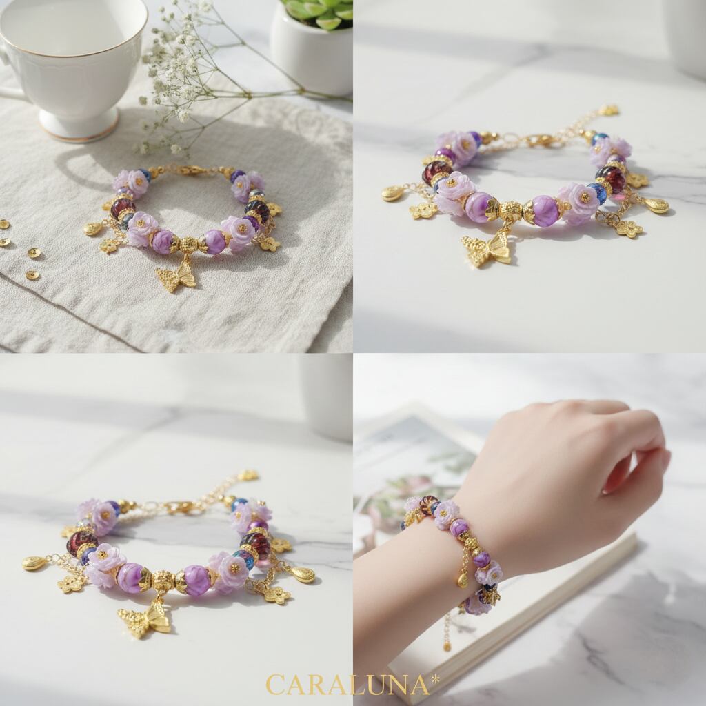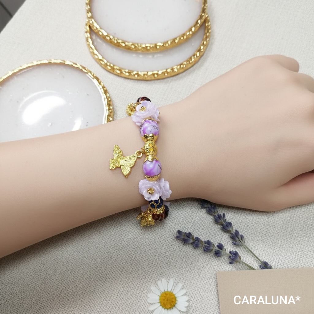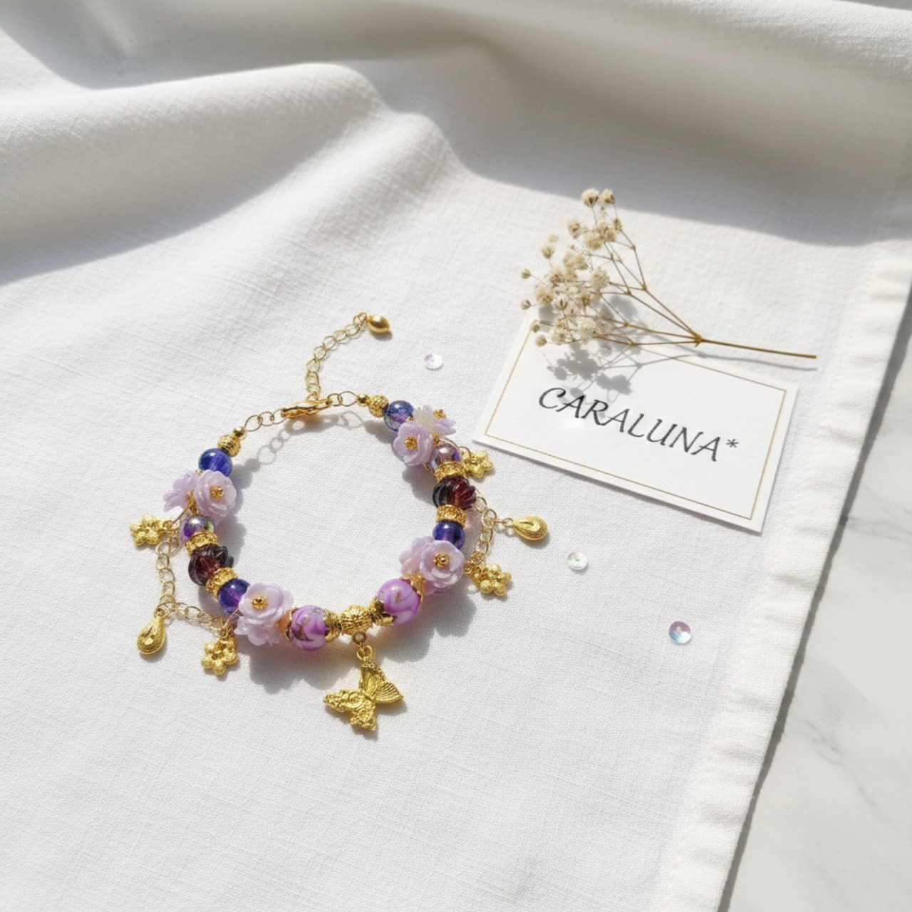 揺れるゴールドの蝶チャームと、立体的なパープルのお花が目を引くワイヤーブレスレットです。