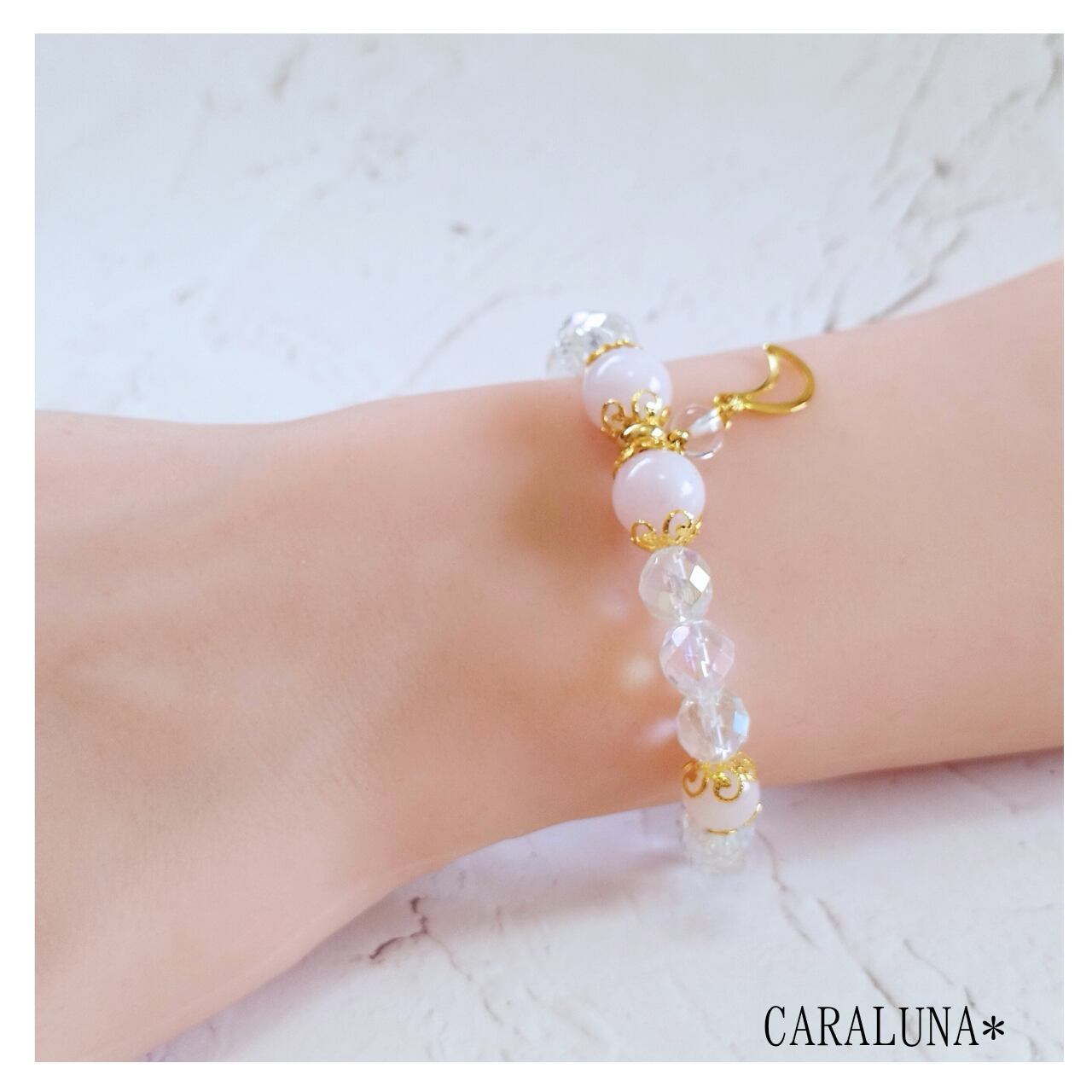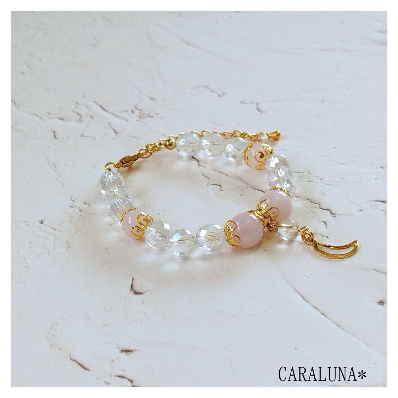 優しい色合いのローズクォーツと月のチャームで、女神からの愛をイメージしたブレスレットです。愛と癒しの石を身につけて、幸運を引き寄せて頂ければと作製しました。